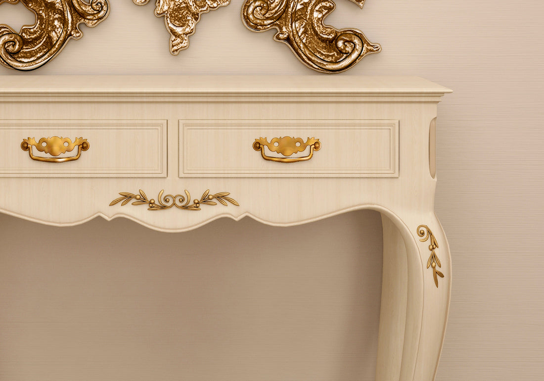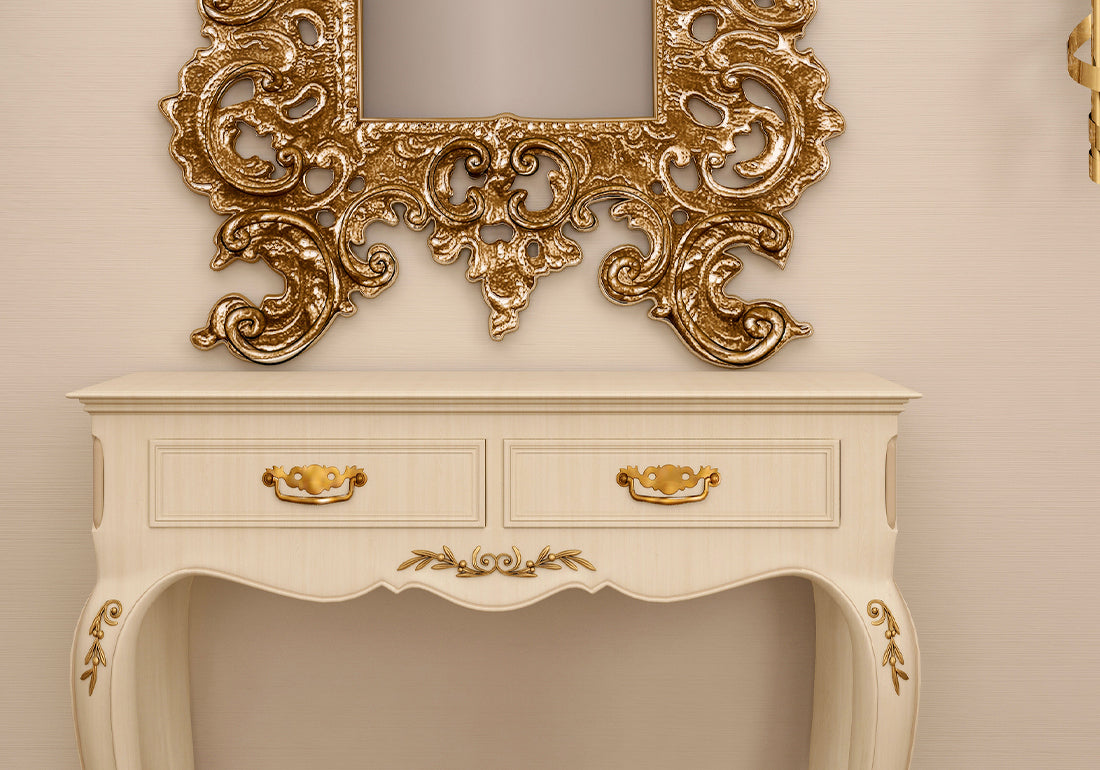 Intricate Hand-Carved Details: The Antique Charm Console Table with Mirror showcases hand-carved accents along its edges and legs, inspired by antique design. Every carving is meticulously crafted, giving the piece an artisanal feel and a unique character that sets it apart.