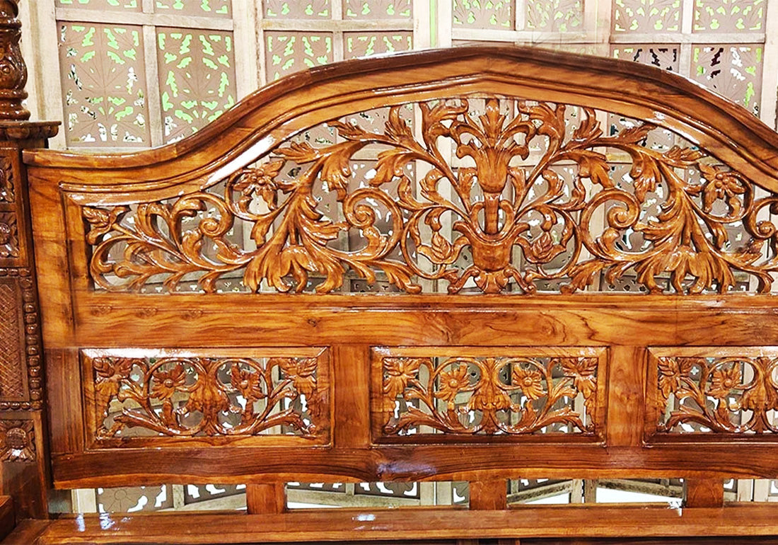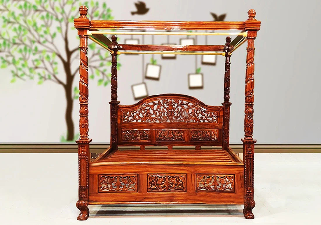 This bed echoes the elegance of antique design through its four poster structure, paying homage to traditional aesthetics. The carefully aged appearance of the wood and the intricate carvings evoke a sense of vintage charm. The headboard and footboard capture the essence of a bygone era while seamlessly integrating with modern comfort.