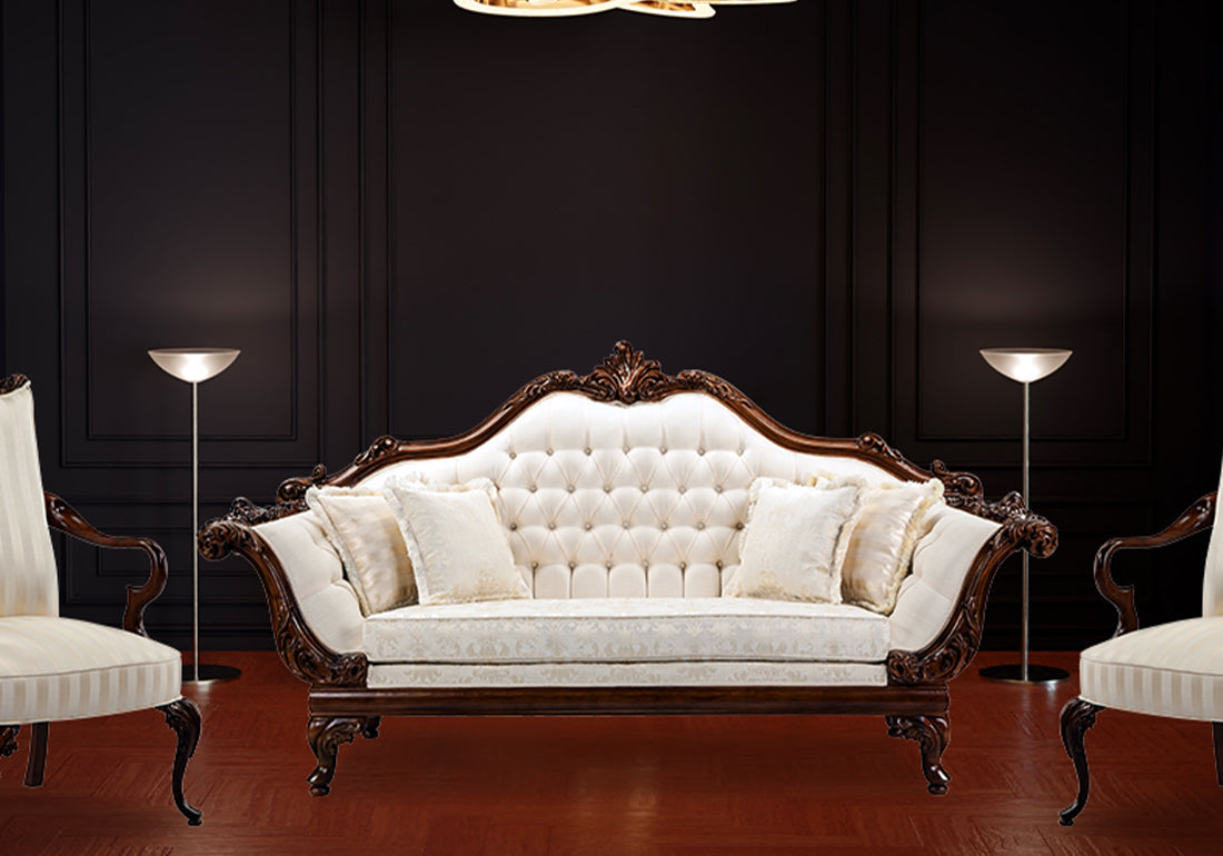 Design Philosophy This sofa set is inspired by traditional artistry, featuring intricate hand-carved details that reflect historical motifs. Perfectly balancing elegance with functionality, it serves as both a centerpiece for grand spaces and a statement of luxury.