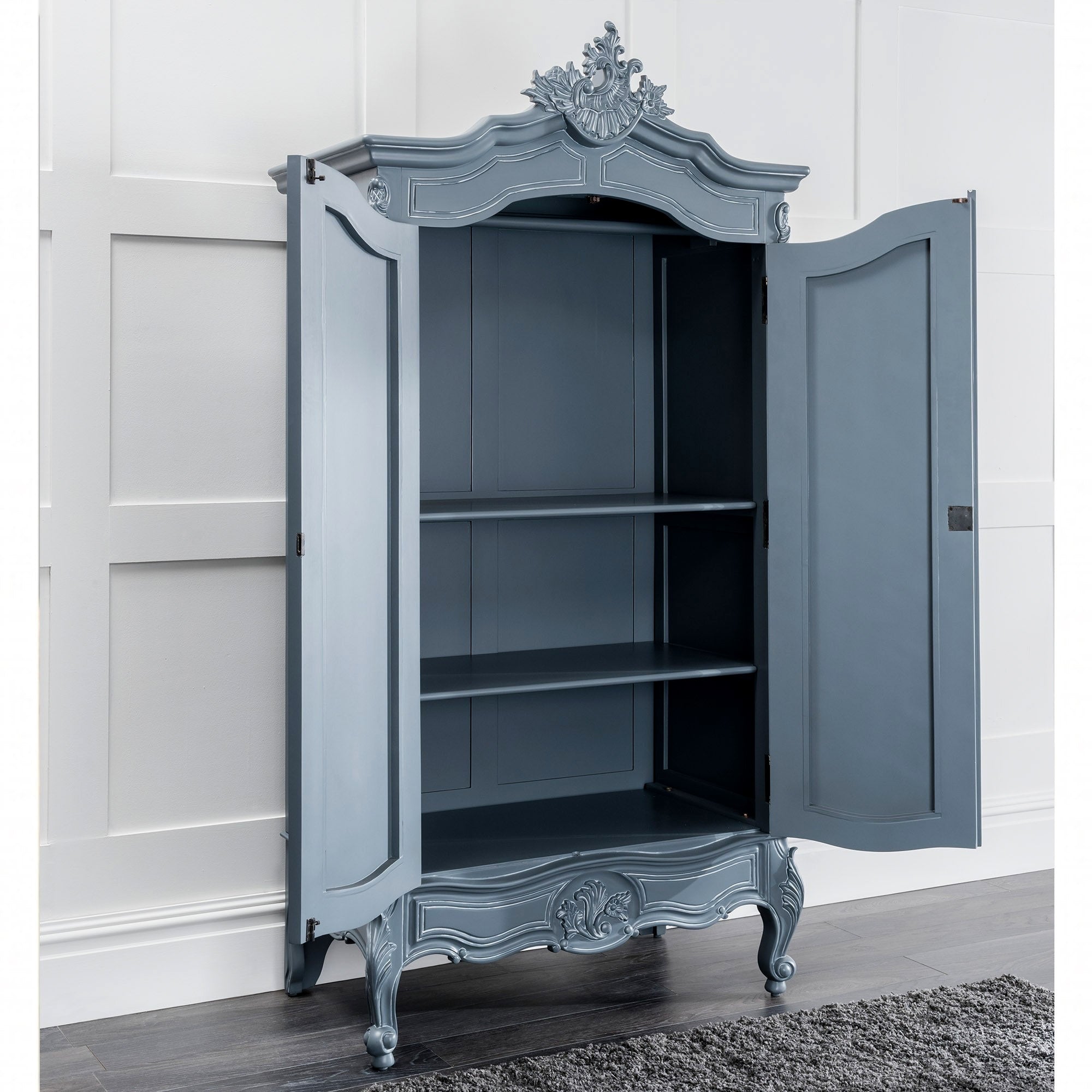Indulge in the timeless beauty of our hand-carved European style silver wardrobe. Meticulously crafted from the finest quality wood, this exquisite piece brings a touch of sophistication and grandeur to your living space. The intricate silver accents showcase the skillful artistry that went into creating this masterpiece. With its spacious compartments and luxurious design, our silver wardrobe offers both functionality and elegance. Transform your home into a haven of European opulence with this statement piece that captures the essence of old-world charm. Elevate your interior decor to new heights with this extraordinary addition to your home furnishings.