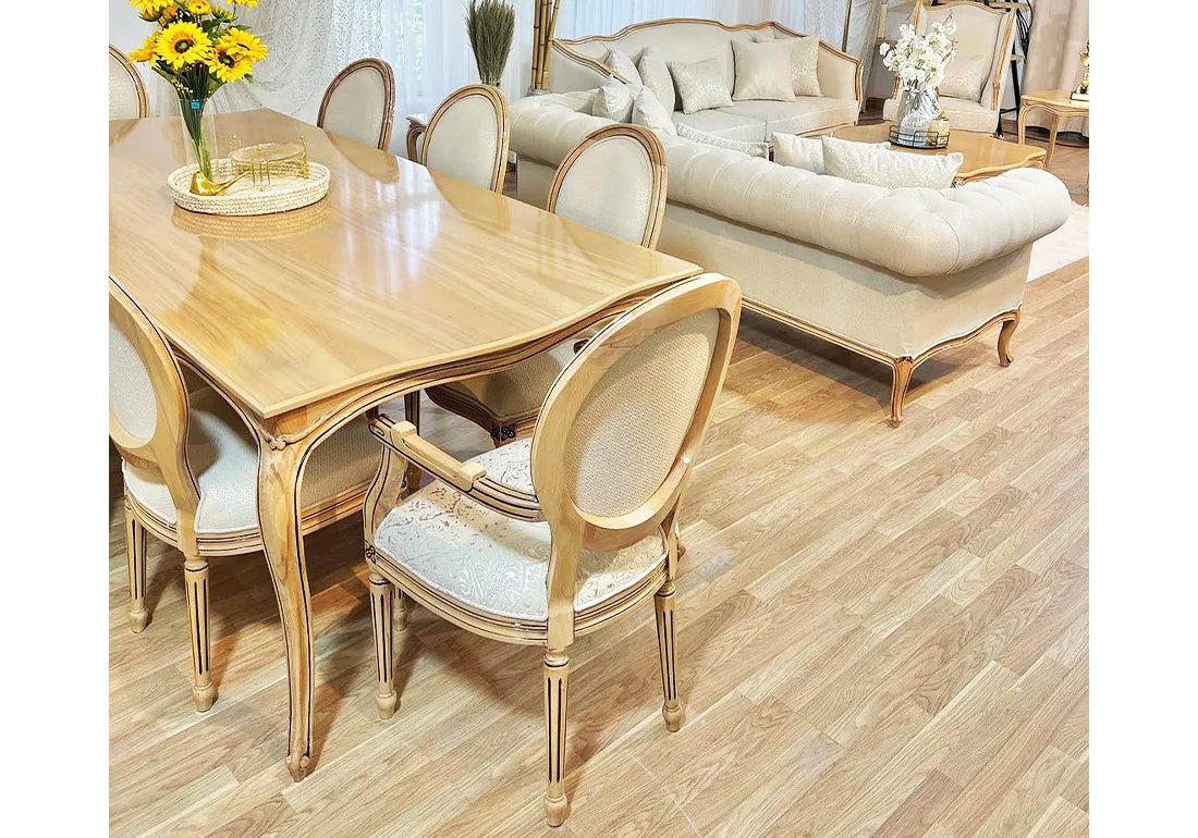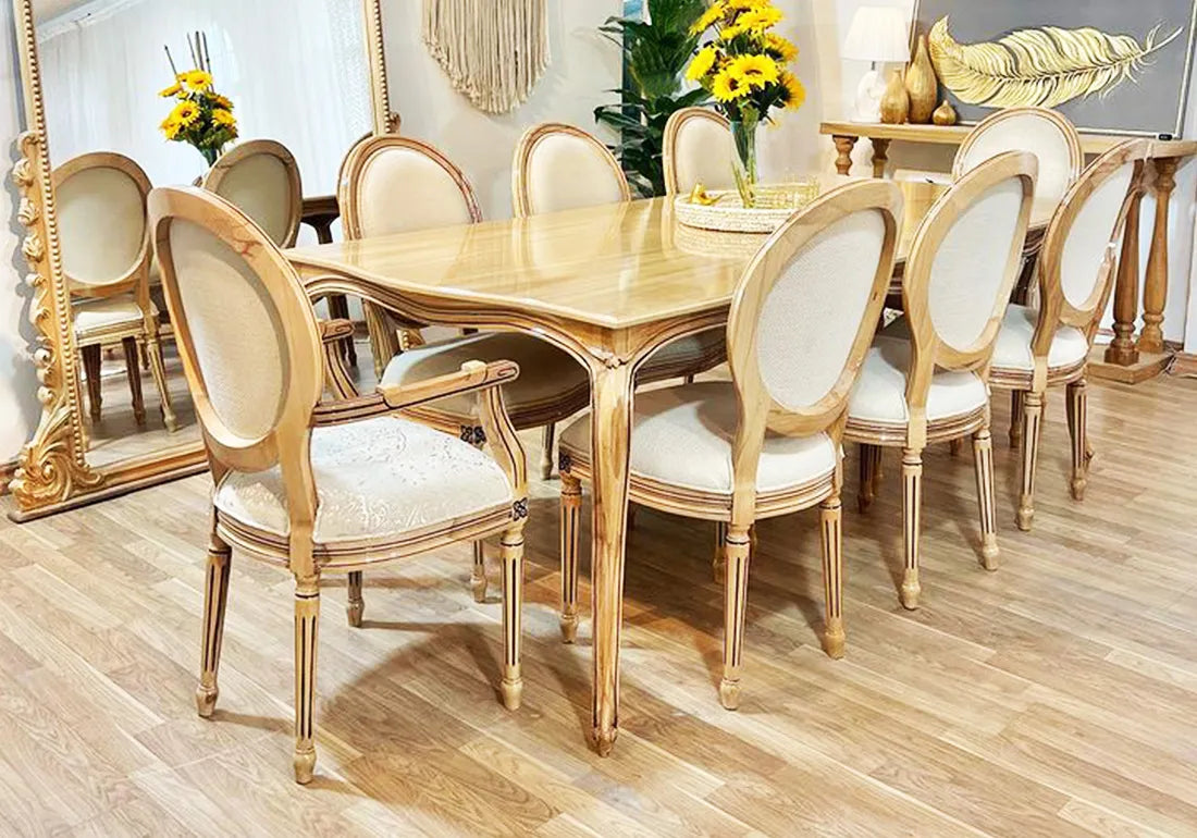 Discover the timeless elegance of our Classical Handmade Crafted Wooden Dining Table Set. Crafted with meticulous attention to detail and a passion for craftsmanship, this exquisite dining table set is the epitome of sophistication and style. Each piece is expertly handcrafted from premium wood, ensuring durability and a rich, natural finish that enhances the beauty of your dining space. Whether you're hosting a grand dinner party or enjoying an intimate meal with family, this stunning table set will be the centerpiece of your dining room, creating an inviting atmosphere that exudes warmth and charm. Elevate your home decor with this classic, handmade masterpiece, and make every dining experience a memorable one. Explore the artistry of timeless design with our Classical Handmade Crafted Wooden Dining Table Set today.