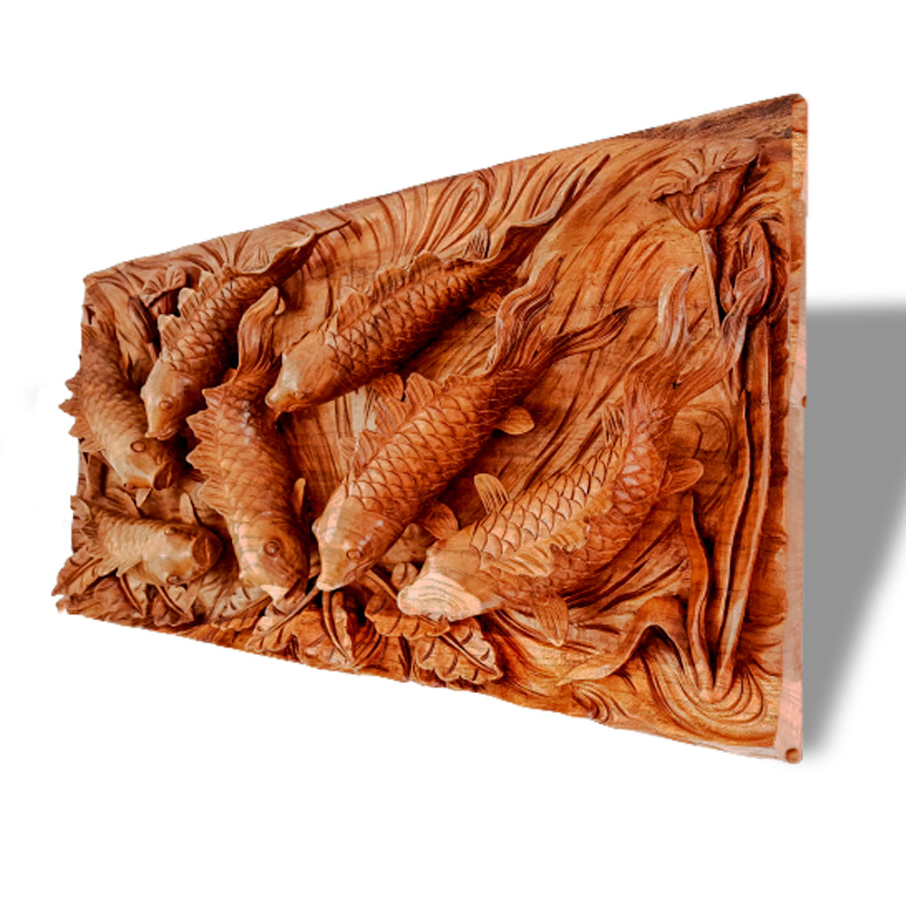 Elevate your space with the mesmerising allure of our Hand-Carved Teakwood Koi Fish Feng Shui Wall Art. Crafted with meticulous detail by skilled artisans, this exquisite masterpiece brings a touch of harmony and luck to your home. Symbolising abundance, perseverance, and good fortune, the graceful Koi fish dance gracefully amidst the rich teakwood canvas, creating a captivating focal point for any room. Embrace the positive energy and serenity that this unique wall art brings, making it a cherished addition to your decor. Immerse yourself in the ancient art of Feng Shui and invite prosperity into your life with this stunning Teakwood Koi Fish Wall Art.