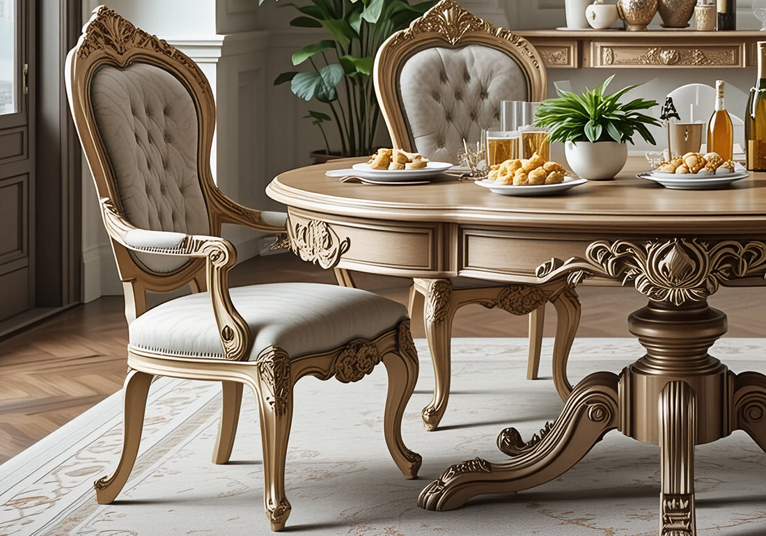 The round table promotes an inviting, inclusive dining experience, making every meal a shared royal affair. Supported by a lavishly carved central pedestal base, the table stands as a statement piece of strength and grace. Each chair is adorned with intricate crown-style carvings and upholstered in plush, button-tufted fabric, offering both comfort and commanding presence.