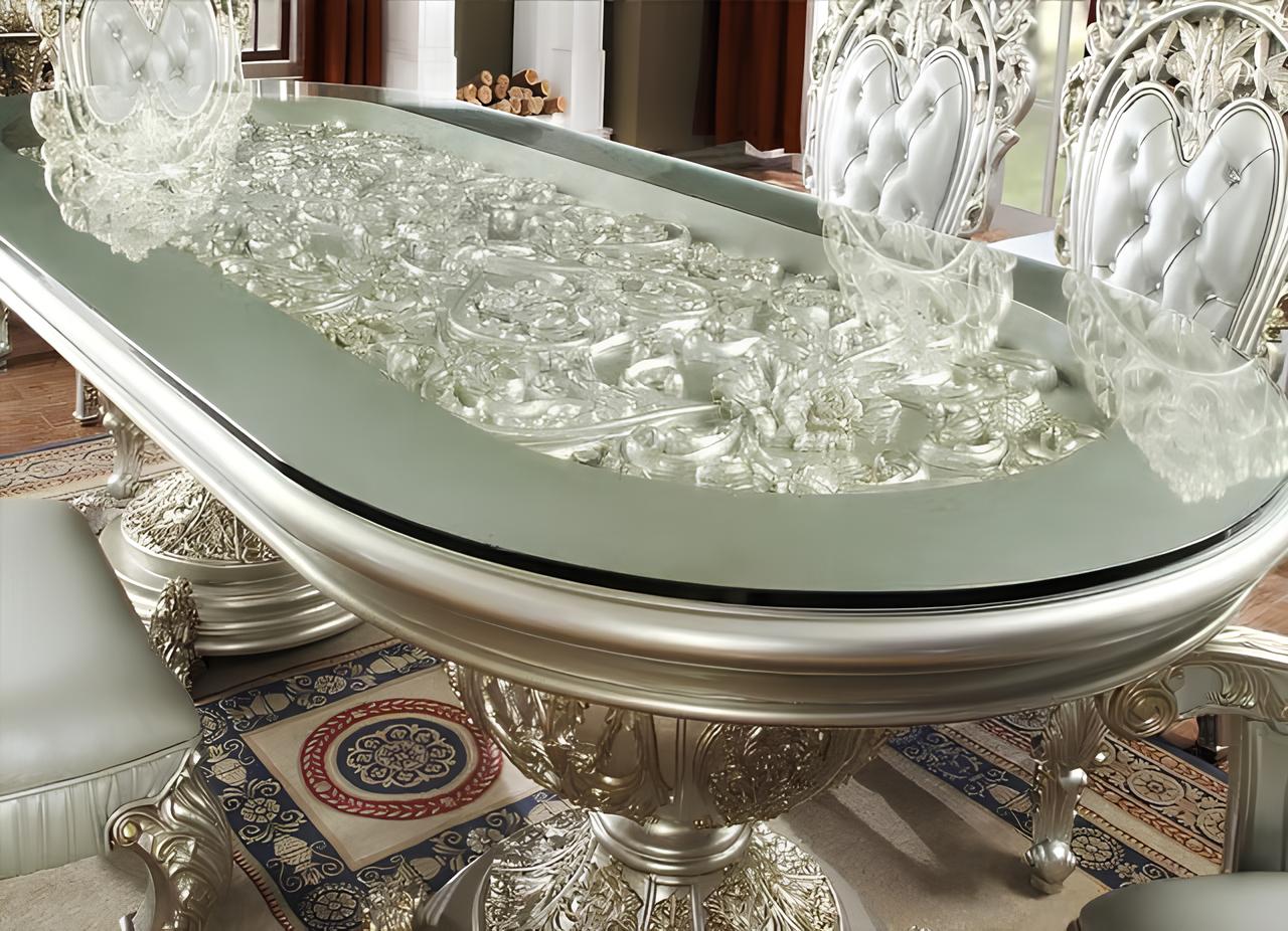 Traditional Luxury Metallic Silver Finish Rectangle Dining Table is a true embodiment of timeless elegance merged with classic European design. This exquisite dining table is crafted with intricate carvings and overlays, all adorned in a rich silver finish on select hardwoods and resin. Its captivating design takes you on a journey to another era, where luxury and sophistication reign supreme.