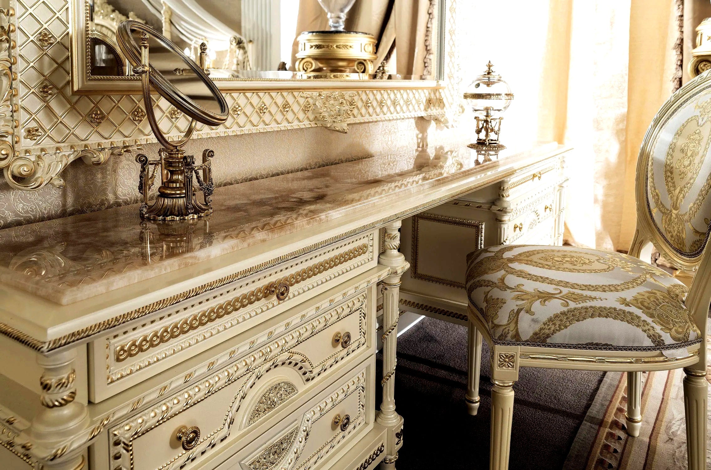 The dressing table features a spacious tabletop, providing ample space for displaying cherished perfumes, cosmetics, and personal mementos. The mirror, framed in the same lavish carvings as the rest of the table, adds a touch of glamour and functionality. With its generous size and adjustable angles, the mirror allows for effortless grooming and self-admiration.