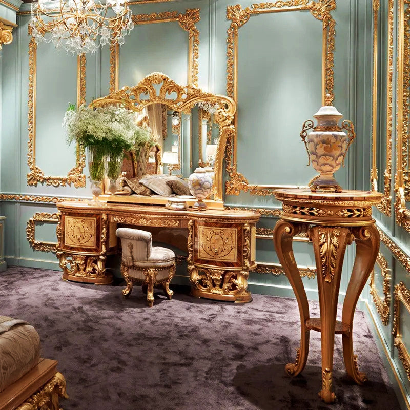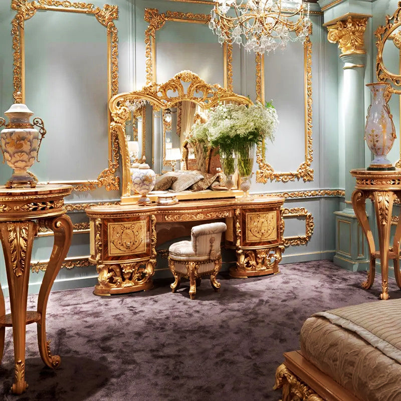 Introducing the epitome of elegance and opulence, the luxury Gold Solid Teakwood Deep Carving Dressing Table. This exquisite piece of furniture combines the richness of solid teakwood with the allure of deep carvings and lavish gold accents, creating a masterpiece that radiates sophistication.
