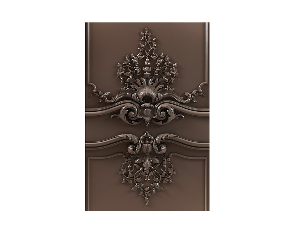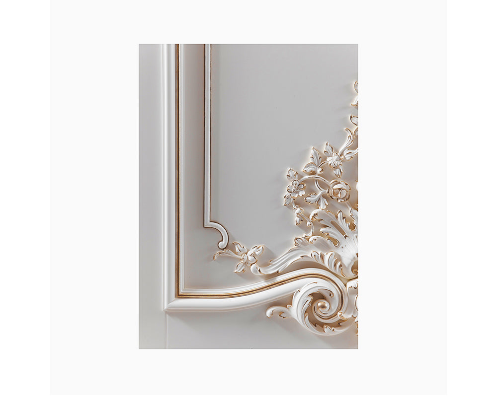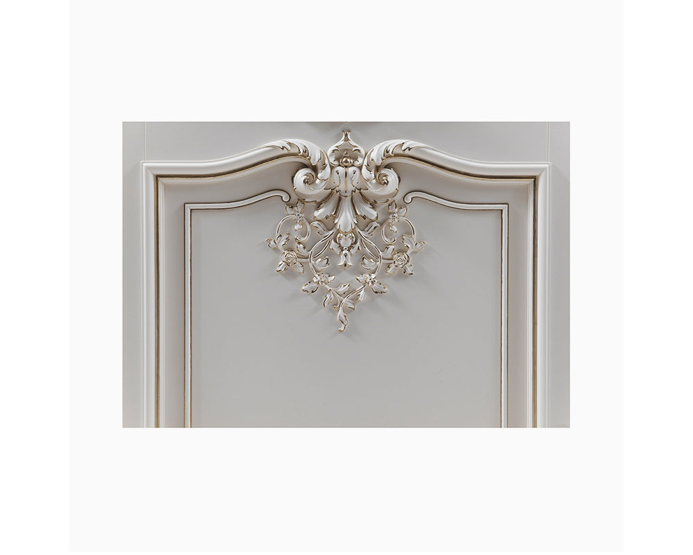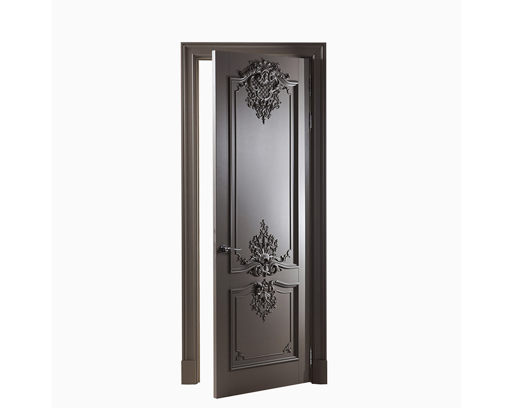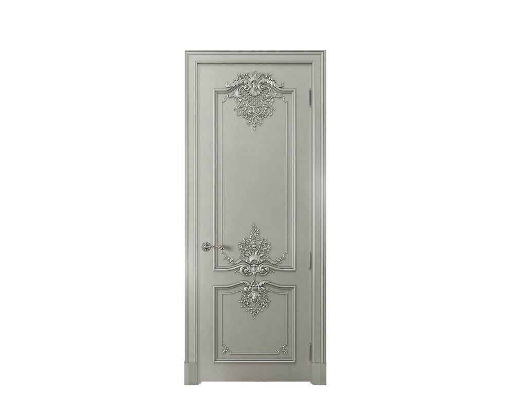 The base of the door is finished in a glossy color suggestive of delicate morning light kissing the horizon. This ethereal tone acts as a backdrop for the numerous design details that adorn the surface. Delicate filigree designs, suggestive of frost on a bright winter morning, are softly engraved into the door, lending it an air of meticulous workmanship.