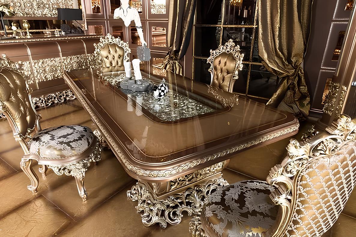 At the heart of this dining set lies the stunning dining table, meticulously handcrafted from solid teak wood. Renowned for its durability and natural beauty, teak wood is the perfect choice for a luxurious dining experience. The table features intricately carved details, showcasing the skillful artistry of our craftsmen. From ornate motifs to delicate patterns, each carving reflects the rich heritage of European design, adding an aura of opulence to your dining area.