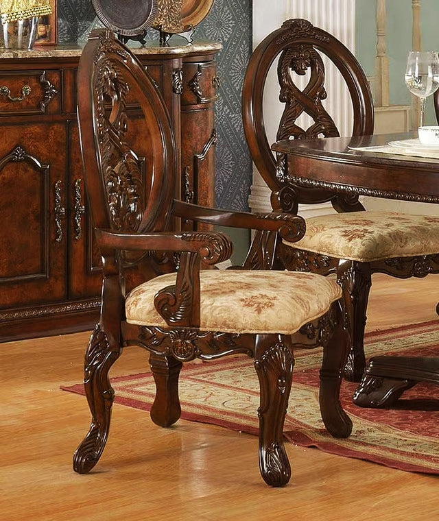 The side chairs and arm chairs from the collection continue the opulent design with decorative accent carvings on the frame, base, and feet. The chenille fabric seat upholstery adds a touch of luxury and comfort. The combination of materials creates visual intrigue, with a chenille fabric seat cushion and an all-wood chair back. The chairs feature graceful cabriole legs with stretchers and curved arms, enhancing the classical flair. Crafted from solid wood with a handsome cherry finish, they embody timeless beauty.