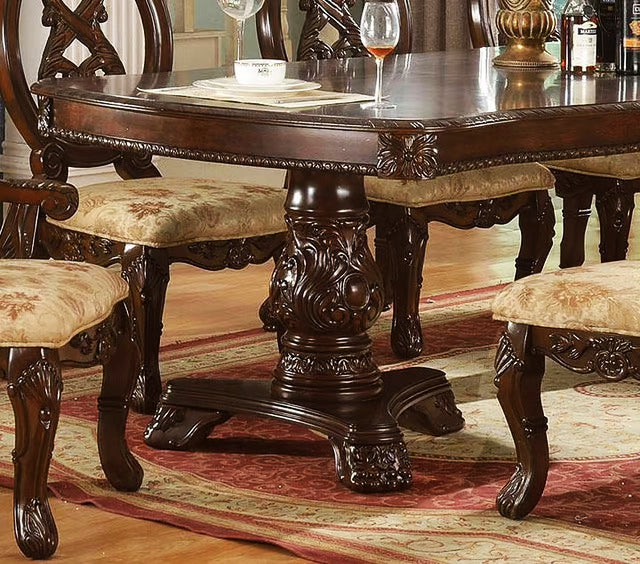 Elevate your dining experience with the magnificent. This traditional dining set is designed to impress, featuring a double pedestal dining table and elegantly upholstered chairs that exude timeless beauty.