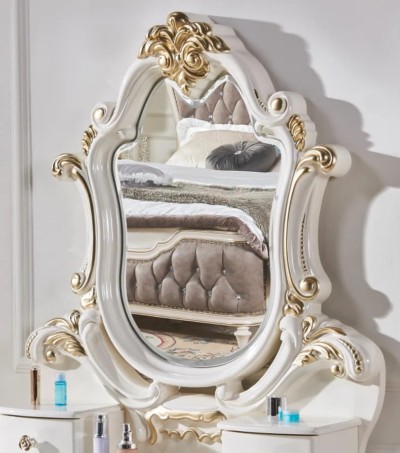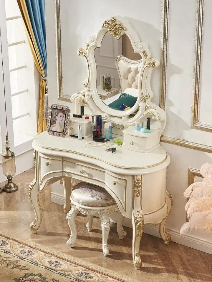 The luxurious European style is further accentuated by the table's elegant legs, which are gracefully carved and meticulously finished. These sturdy legs provide stability and support, ensuring the dressing table stands as a regal centerpiece in any bedroom or dressing area.