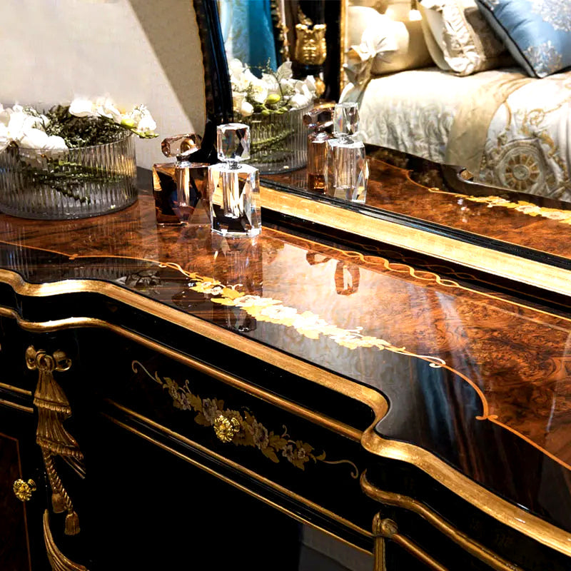 This black French-style hand-carving dressing table is more than just a piece of furniture; it is a work of art that elevates any space it graces. Whether placed in a luxurious bedroom, a stylish dressing room, or an opulent boudoir, it becomes the focal point, radiating an air of sophistication and refinement.