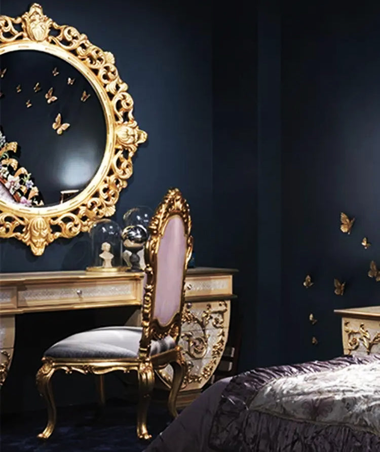 Furthermore, the dressing table features multiple drawers adorned with golden handles, offering convenient storage solutions while maintaining the overall aesthetic. These drawers are expertly designed with smooth gliding mechanisms, ensuring effortless access to your prized possessions.