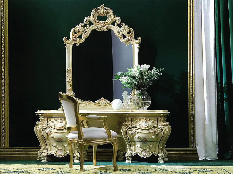 The table features a spacious and smooth tabletop, providing ample room for displaying cosmetics, jewelry, and other personal items. It is complemented by a large, adjustable mirror framed with the same ornate carvings, allowing you to effortlessly achieve the perfect angle for your reflection.