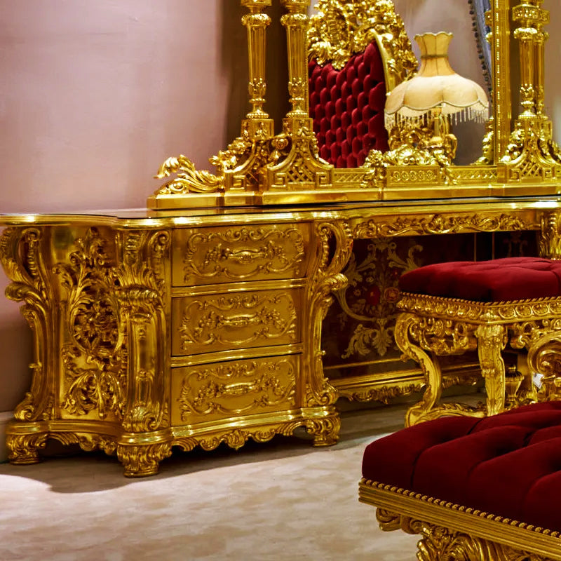 The dressing table features multiple drawers, each adorned with ornate golden handles, providing convenient storage for your cosmetics, perfumes, and accessories. The drawers are lined with plush velvet, ensuring your delicate items are kept safe and secure.